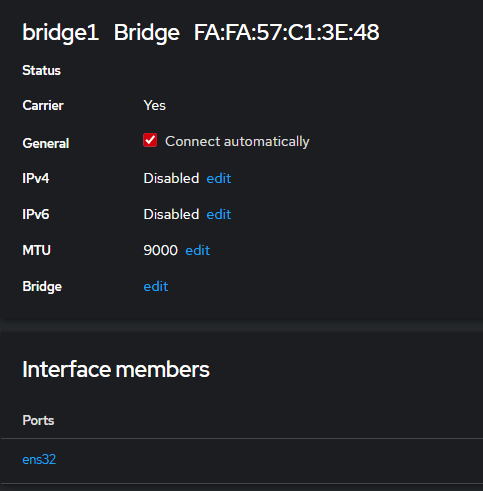 After the new bridge is added we need to disable IPv4 and IPv6. If we don’t the bridge drops until it receives an IP. An increase of the MTU is also a safe bet at 9000 although we don’t expect any VXLAN traffic to pass through this bridge.